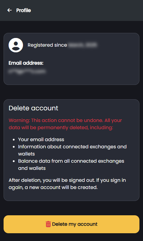 Clicking Delete my account will permanently remove all your data from CoinSyncer.